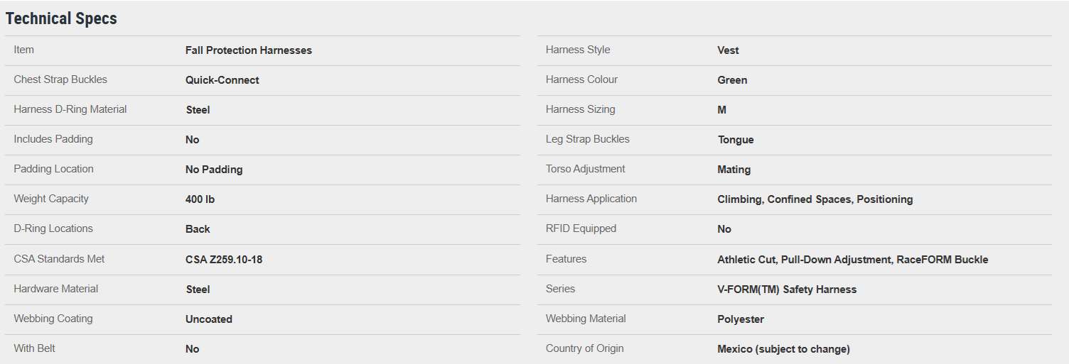 This ANSI/CSA/OSHA-certified, RFID-equipped, green, medium harness has a quick-connect chest and tongue-style leg strap buckles. It has a steel D-ring that is located at the back and has a shoulder and waist padding. This harness has a weight capacity of 400 pounds and can be used in fall arrest applications.